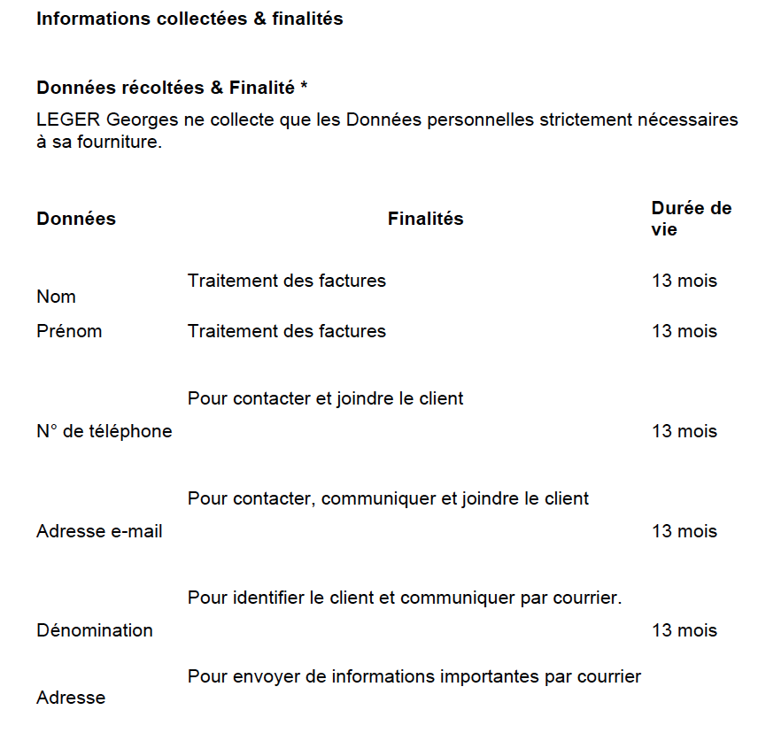 Notre politique de confidentialité définit comment LEGER Georges utilise et protège les informations que vous avez fournies lorsque vous utilisez l’un de nos sites ou durant nos échanges...