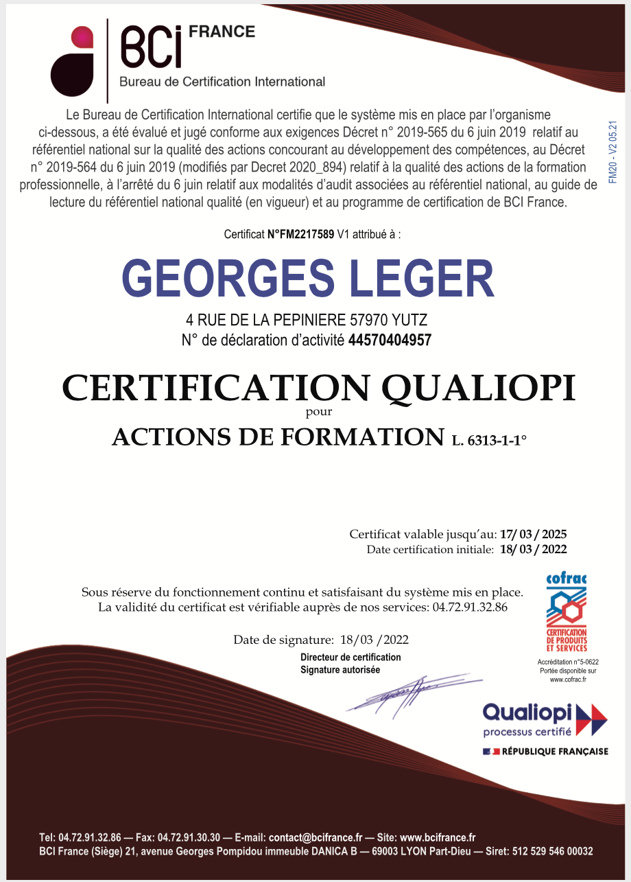 2. QUALIOPI : Cette certification est la preuve de mon engagement vers une amélioration continue de la qualité de mes actions de formation. Je suis en mesure d'appliquer les critères de QUALIOPI pour garantir une expérience d’apprentissage optimale, ce qui renforce ma légitimité auprès des apprenants et des entreprises.